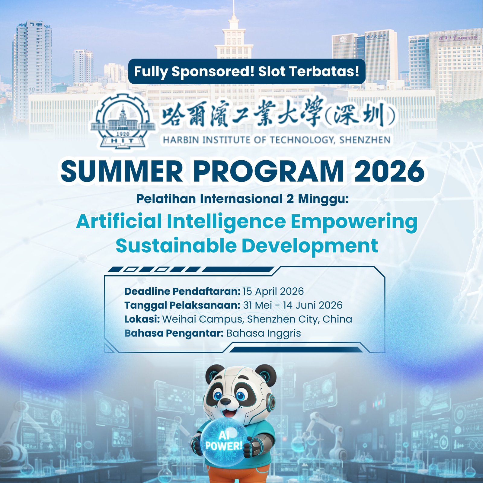 Ikuti Summer Program Artificial Intelligence Empowering Sustainable Development selama 2 minggu di Harbin Institute of Technology di Shenzen. Pelajari langsung teknologi AI terbaru dan pengalaman budaya China!