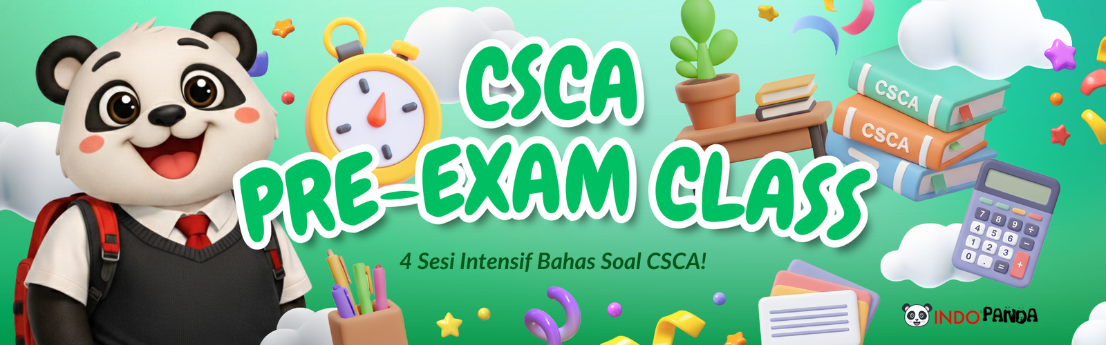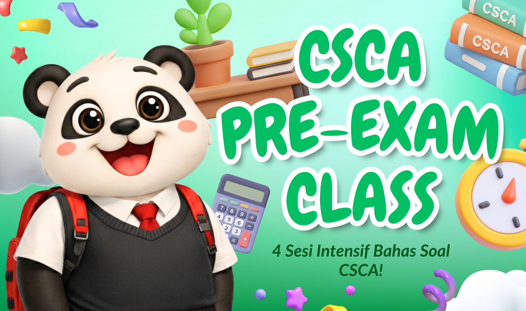 Buat Sobat Pandai yang mau ikut ujian CSCA tapi masih belum pede atau tidak keburu untuk belajar dalam jangka waktu panjang, tenang aja! IndoPanda punya CSCA Pre-Exam Class yang siap bantu kamu mempersiapkan diri. Di kelas ini, kamu bisa drill soal-soal latihan sekaligus dapat tips & trik langsung dari Trainer berpengalaman melalui 4 sesi intensif. Kelas ini dirancang khusus buat kamu yang ingin fokus mempersiapkan ujian CSCA dengan cara yang efektif dan terarah melalui latihan soal dan pengetahuan tentang ujian CSCA.