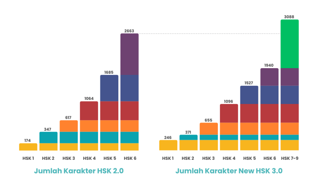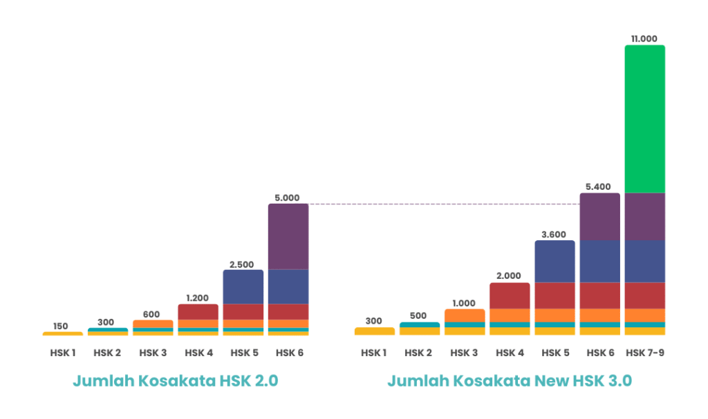 Sistem ini diperkenalkan agar penguasaan bahasa pada setiap level lebih seimbang. HSK 2.0 mewajibkan untuk menguasai 600 kosakata pada level HSK 3, sedangkan pada level selanjutnya, jumlah kosakata yang wajib dikuasai bertambah sekitar 2 kali lipat. Pada New HSK 3.0, jumlah kosa kata yang wajib dikuasai pada level 1 naik menjadi 500 kata, tapi untuk level 6 pada kedua HSK kurang lebih sama.