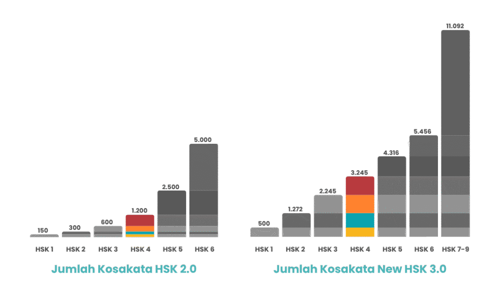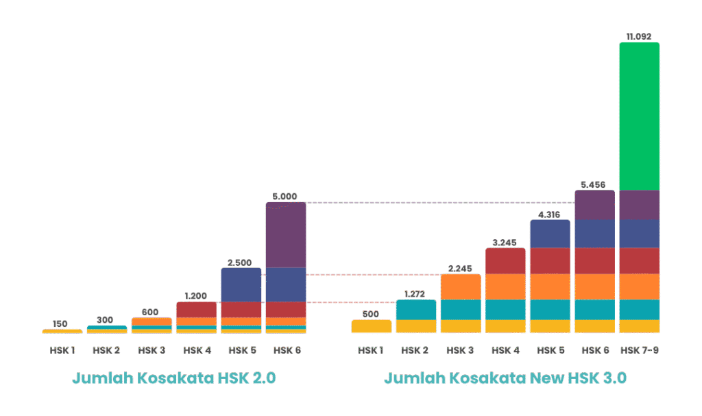 Pada sistem lama, banyak pelajar merasa bahwa lulus HSK 3 berarti sudah “setengah jalan” atau setengah bisa Mandarin, padahal baru menguasai sekitar 600 kosakata dari total 5000 kosakata yang dibutuhkan untuk HSK 6. Wah, jauh juga ya.
