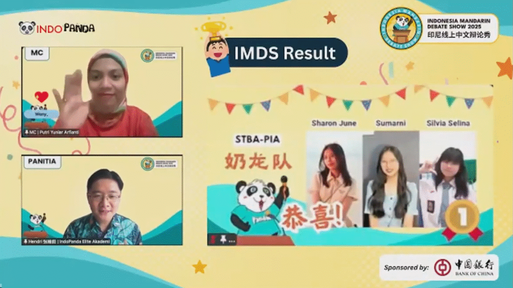 Setelah sesi debat dan pembagian doorprize selesai dilakukan, tiba saatnya segmen yang paling ditunggu-tunggu, yakni pengumuman pemenang. Selain mengumumkan juara 1-3, segmen ini juga diisi dengan pemilihan top debator dan tim favorit pilihan audiens. Setelah melalui penilaian ketat dari tiga juri, juara satu berhasil diduduki oleh 奶龙队 dengan ketiga anggotanya: Sharon June, Sumarni, dan Silvia Selina dari STBA-PIA. Buat Sobat Pandai yang ketinggalan info lengkapnya, ini dia daftar pemenang di IMDS 2025!