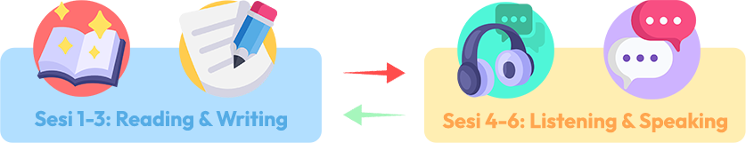 Setiap 3 sesi difokuskan pada Reading & Writing, lalu dilanjutkan dengan Listening & Speaking di sesi berikutnya. Pola ini diulang agar progres belajar kamu tetap merata dan tuntas!