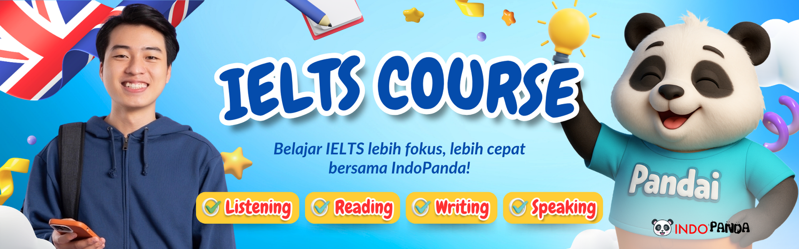 Sudah punya basic IELTS tapi ingin naik level untuk lolos ke kampus impian atau mengejar peluang karier internasional? Program ini buat kamu! Fokus utama IndoPanda adalah meningkatkan keempat skill penting IELTS: Listening, Reading, Writing, dan Speaking dengan pendekatan strategi, bukan sekadar teori.